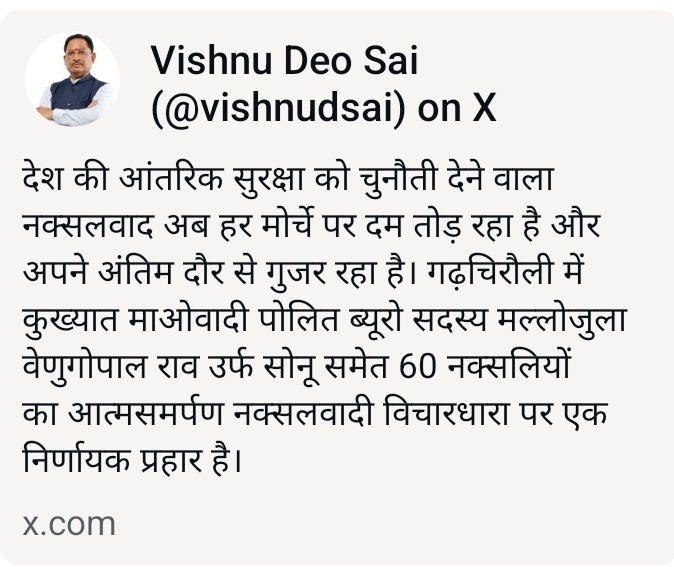 रायपुर 15 अ मुख्यमंत्री श्री विष्णु देव साय के नेतृत्व में छत्तीसगढ़ सरकार की दृढ़ इच्छाशक्ति, संवेदनशील नीतियों और सुरक्षा बलों के निरंतर प्रयासों के परिणामस्वरूप नक्सलवाद पर निर्णायक प्रहार जारी है। सुकमा जिले में आज 50 लाख रुपए के इनामी सहित कुल 27 सक्रिय माओवादियों ने आत्मसमर्पण किया है। यह न केवल नक्सल हिंसा के अंत की दिशा में एक बड़ा कदम है, बल्कि यह बस्तर अंचल में विश्वास, सुरक्षा और विकास के नए युग की शुरुआत का प्रतीक भी है। मुख्यमंत्री श्री साय ने कहा कि पीएलजीए बटालियन नंबर-01 के हार्डकोर नक्सली सहित विभिन्न स्तरों पर सक्रिय रहे माओवादियों का आत्मसमर्पण राज्य शासन की “नक्सलवादी आत्मसमर्पण एवं पुनर्वास नीति 2025” और “नियद नेल्ला नार योजना” की सफलता का प्रत्यक्ष प्रमाण है। शासन की संवेदनशील पहल लगातार स्थापित हो रहे सुरक्षा शिविरों और वनांचलों में प्रशासन के प्रति बढ़ते जन-विश्वास से यह परिवर्तन संभव हुआ है। गढ़चिरौली में कुख्यात माओवादी पोलित ब्यूरो सदस्य मल्लोजुला वेणुगोपाल राव उर्फ सोनू समेत 60 नक्सलियों का आत्मसमर्पण नक्सलवादी विचारधारा पर एक निर्णायक प्रहार है। हमारे शौर्यवान सुरक्षाबल दिन-रात अदम्य साहस के साथ इस लड़ाई को अंजाम दे रहे हैं और सफलता प्राप्त कर रहे हैं। मुख्यमंत्री विष्णु देव साय ने कहा कि सरकार ने बंदूक छोड़ने वालों को सम्मानपूर्वक मुख्यधारा में लाने का रास्ता दिखाया है।उन्होंने कहा कि सरकार का लक्ष्य केवल नक्सलवाद का अंत नहीं, बल्कि उन क्षेत्रों में स्थायी शांति और विकास की स्थापना करना है जहाँ कभी भय और हिंसा का साया था। आज वही इलाके संवाद, शिक्षा, सड़क, स्वास्थ्य और रोजगार की नई दिशा पकड़ रहे हैं। राज्य के पुलिस बल, डीआरजी, सीआरपीएफ, कोबरा, एसटीएफ तथा अन्य सुरक्षा एजेंसियों ने अपनी अदम्य वीरता, संयम और रणनीतिक कौशल से इस संघर्ष को निर्णायक मोड़ पर पहुँचाया है। मुख्यमंत्री ने सभी सुरक्षाबलों को इस सफलता के लिए बधाई देते हुए कहा कि उनके साहस, अनुशासन और समर्पण से ही बस्तर में विश्वास का माहौल स्थापित हुआ है। मुख्यमंत्री श्री साय ने कहा कि प्रधानमंत्री नरेंद्र मोदी जी के नेतृत्व और केंद्रीय गृह मंत्री अमित शाह जी के मार्गदर्शन में भारत ‘नक्सल मुक्त राष्ट्र’ के लक्ष्य की ओर तीव्र गति से बढ़ रहा है। छत्तीसगढ़ सरकार इस राष्ट्रीय संकल्प में पूरी निष्ठा और समर्पण के साथ अग्रसर है।